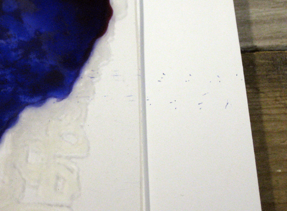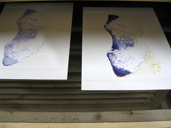 I caught a little beetle having a sip of paint off one of my plates last night. I didn’t notice the trail he left until this morning! A quick clean up and I was off to make another run of prints. I have to repaint the plate every time to get a good image. I run two off anyway, but you can see how much lighter the second pull (on the left) was.