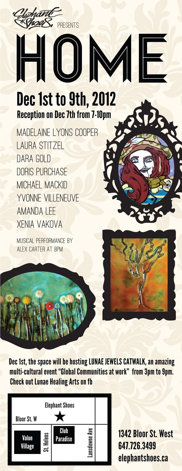 I’m going to have some new sculpture pieces I’ve been working on up at Elephant Shoes in December for the show HOME. Cheryl does a lovely job turning the store into a dedicated gallery space during shows, and the openings have a great atmosphere. Stop by on the 7th to see the art and try some of my homemade hummus!